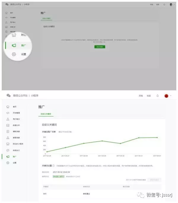 小程序的推廣功能,支持自定義關聯關鍵詞。現在在小程序后臺就能添加關鍵詞進行審核,普通微信用戶就可以通過關鍵詞搜索直接找到相關小程序,就像當年很多企業做百度關鍵詞優化一樣。